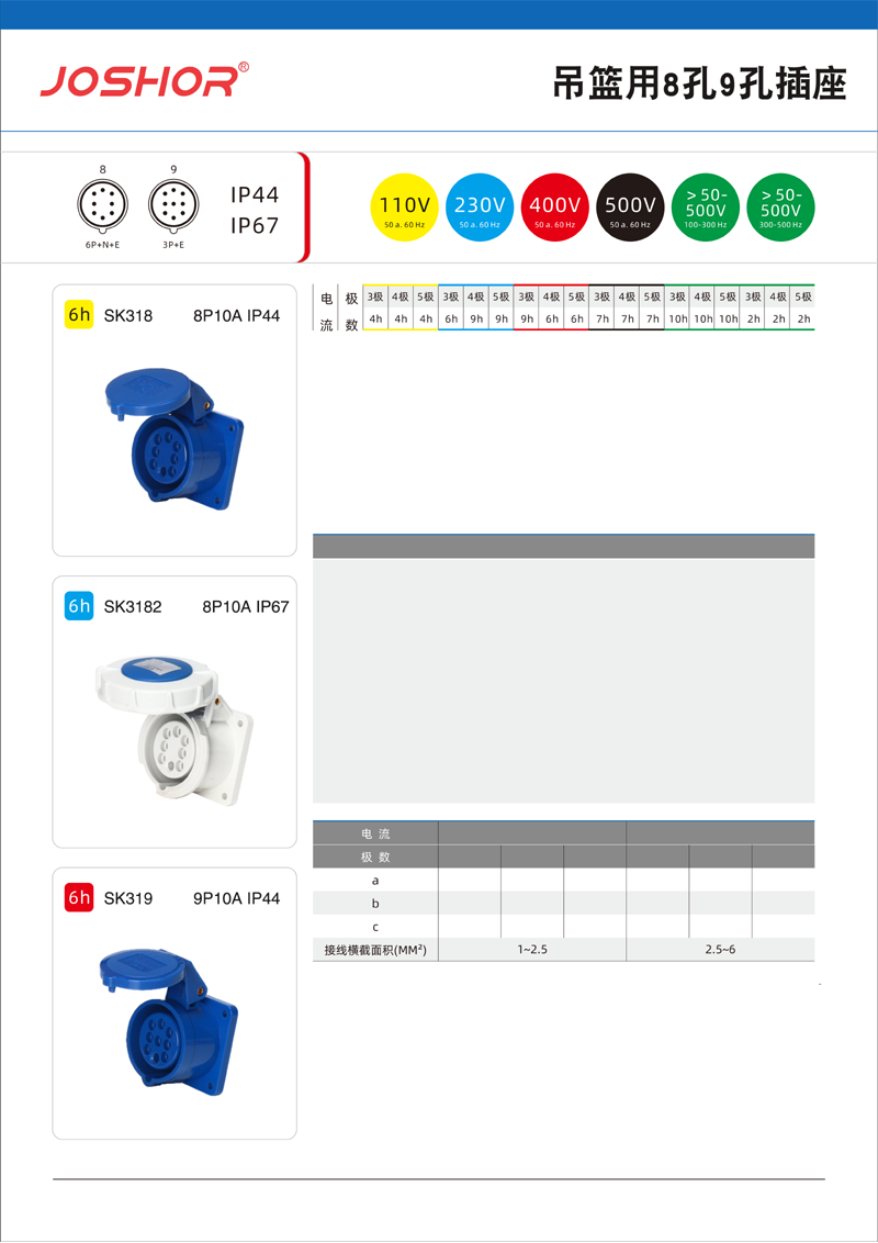 JOSHOR吊篮专用工业暗装插座SK318 8孔10A/6P+N+E/IP44/6H/380V